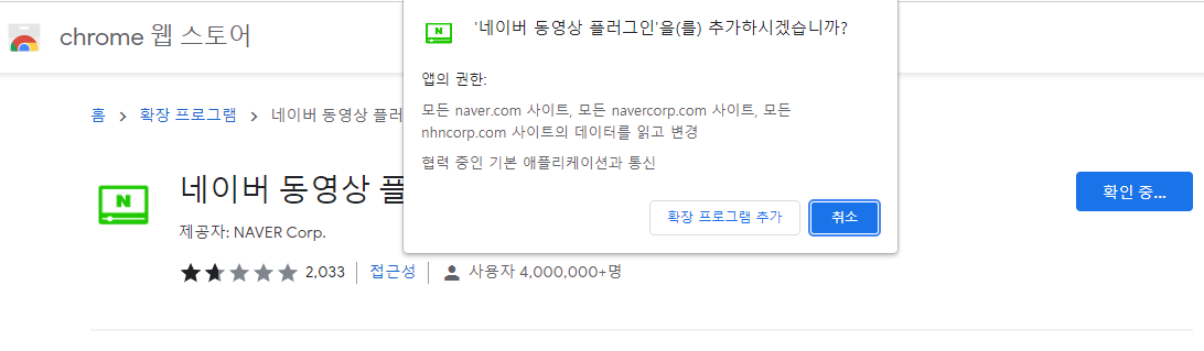 크롬 웹스토어에서 네이버 동영상 플러그인 검색 후 설치합니다.